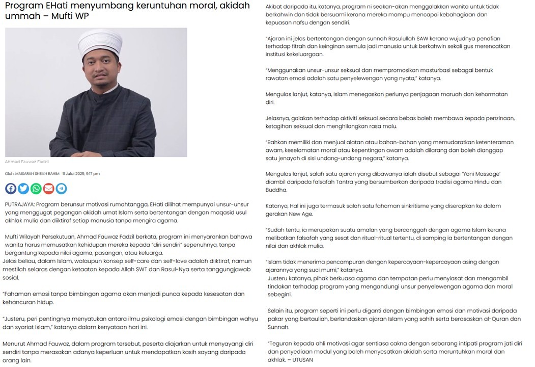 | 11 Julai 2025 | "Program EHati menyumbang keruntuhan moral, akidah ummah - Mufti WP" | |
