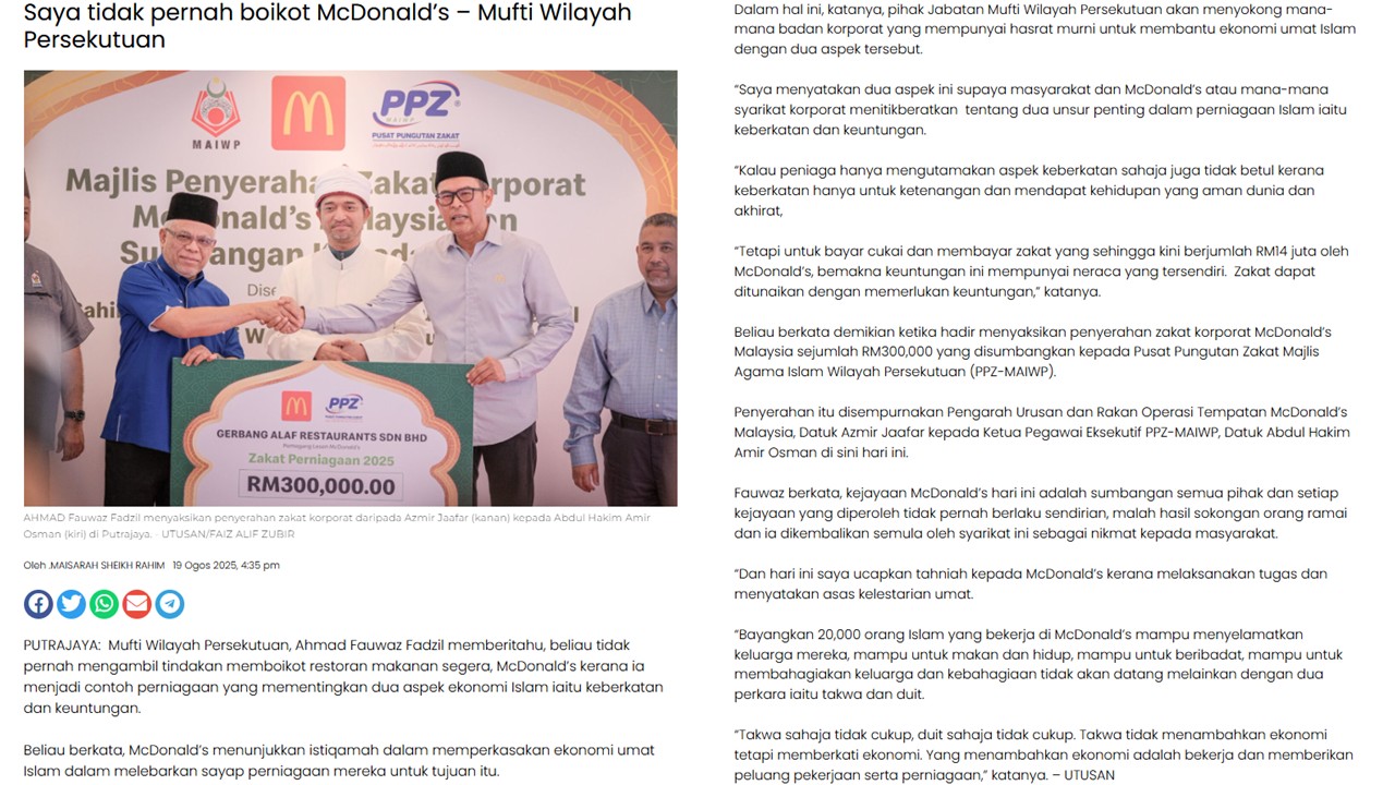| 18 Ogos 2025 | "Saya tidak pernah boikot McDonald's - Mufti Wilayah Persekutuan" | |